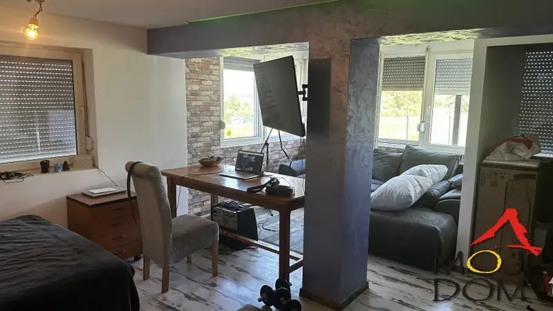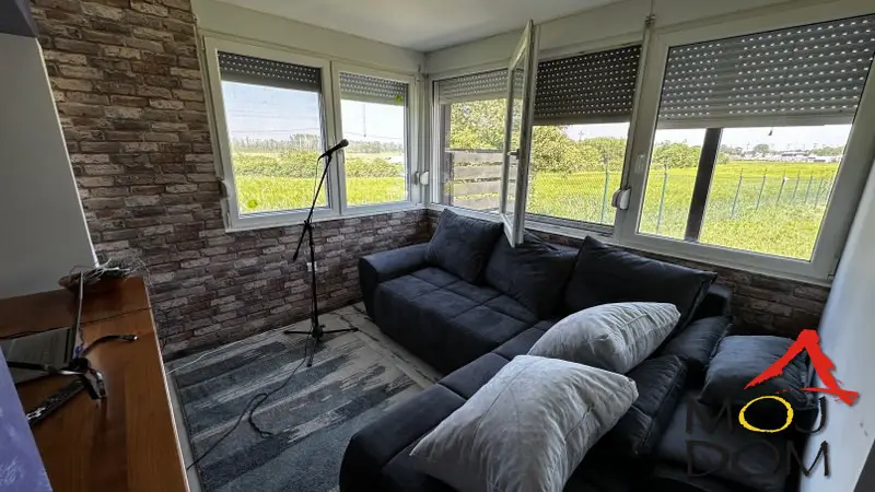 Kuća u neposrednoj blizini Beočina. Agencija Moj Dom prodaje gotovo novu kuću površine 80m2 na placu od 5ari ( 500m2 ). Kuća je idealna kako za život manje porodice tako i kao mesto za kancelariju ili neki vid tihe delatnosti. Okružena zeleni