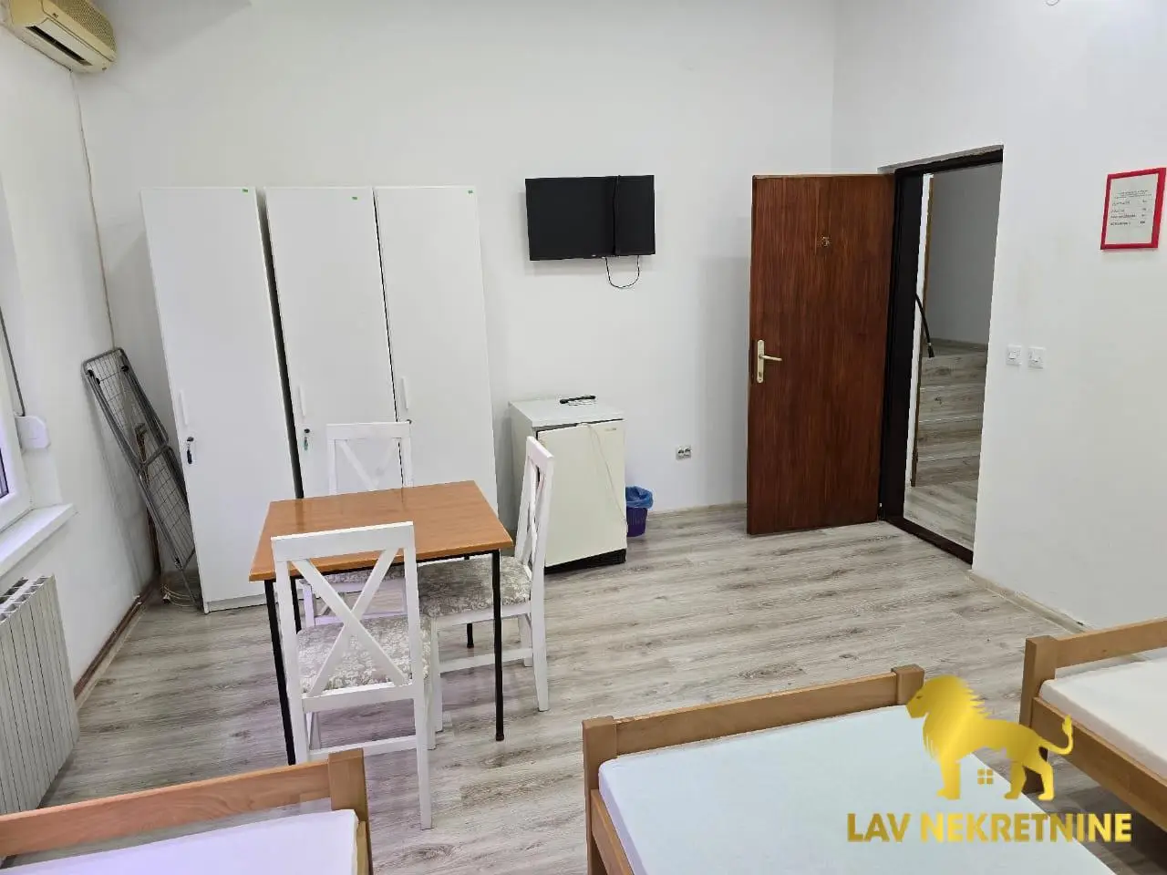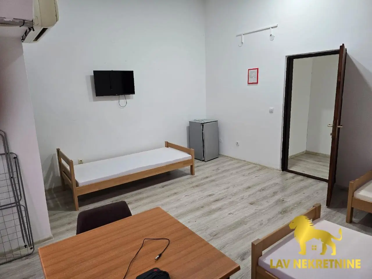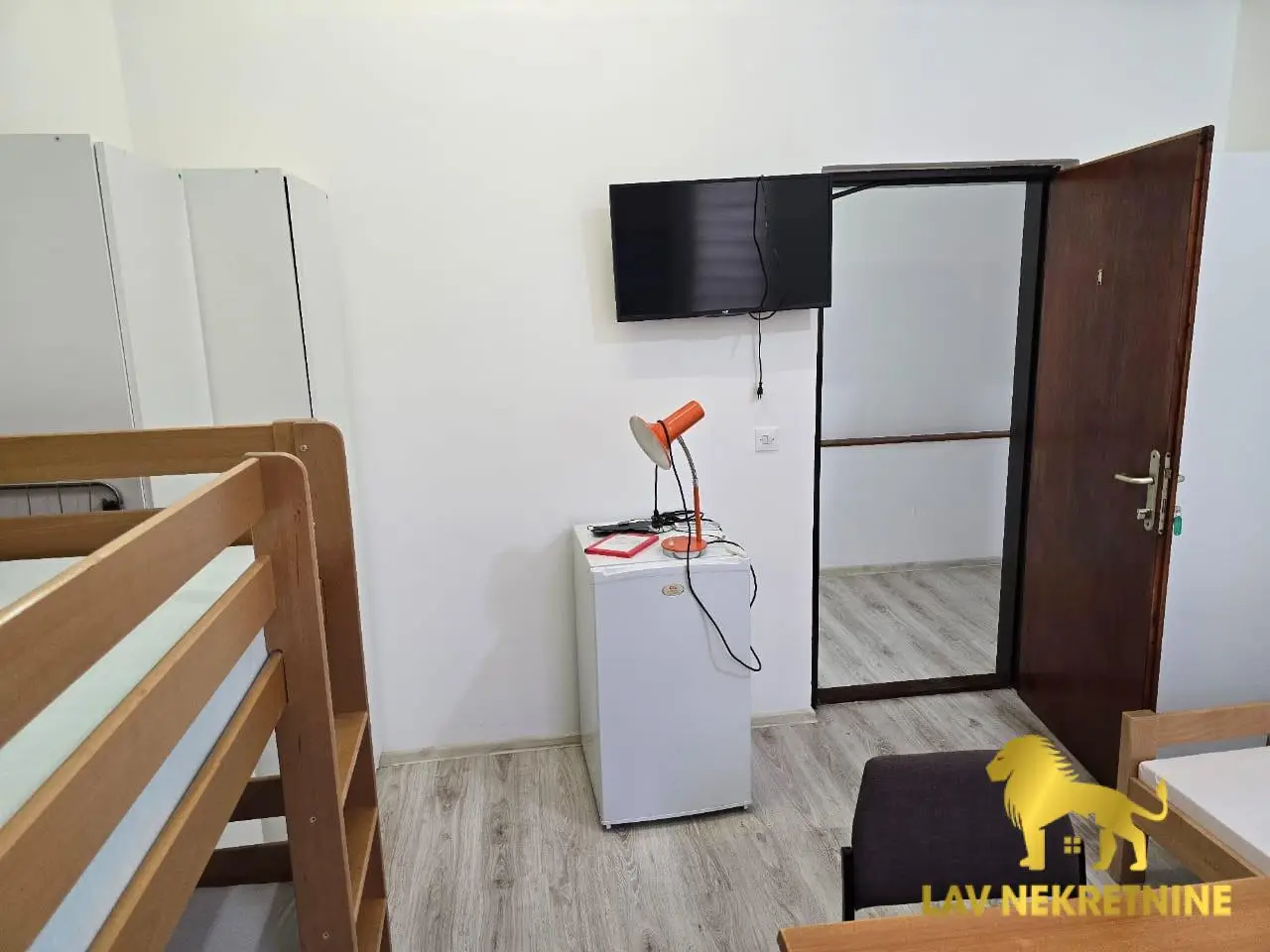Enterijer je potpuno opremljen: 12 kreveta, 12 ormarića, 12 stolica, četiri stola i kuhinjski sto sa klupama. Za maksimalnu udobnost, stan ima četiri nova televizora, pet frižidera, mašinu za pranje veša i mašinu za sušenje veša.