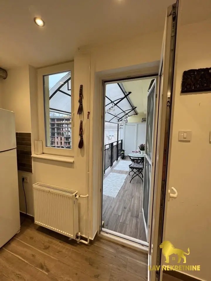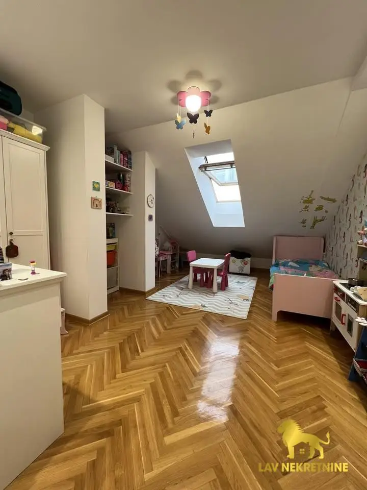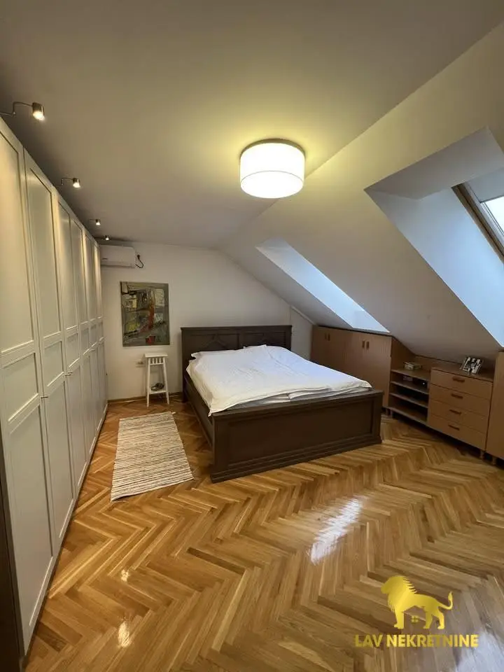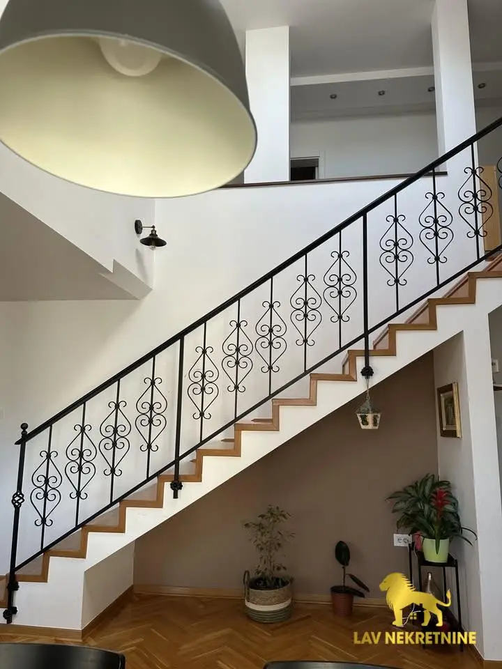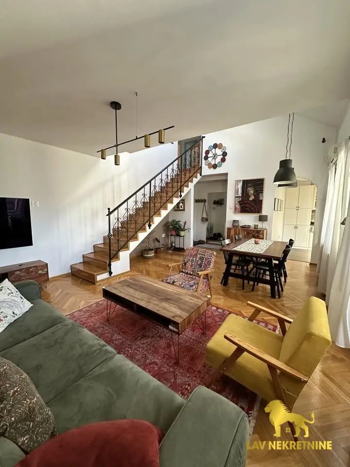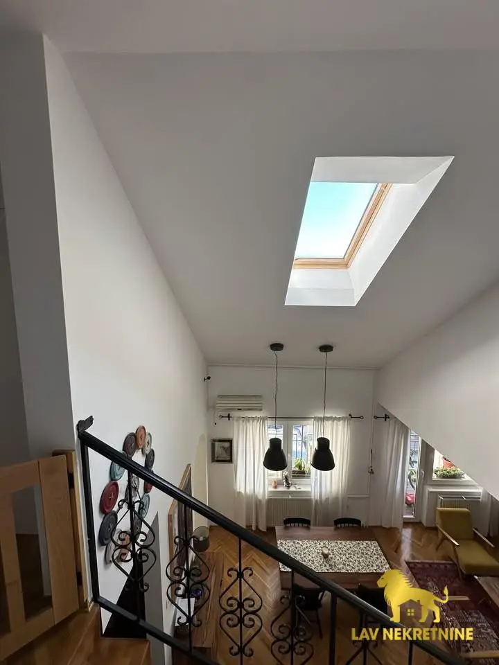Cara Dusana, petosoban stan na dva nivoa. U donjoj etazi visina plafona je 6m. Postoji mogucnost kupovine dva parking mesta.