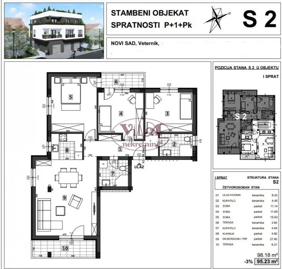 Prodaje se lep cetvorosoban stan u manjoj zgradi, urbanoj vili,na samoj granici Novog Sada i Veternika u lepoj i širokoj ulici, blizu svih urbanih sadržaja. Stan se nalazi na prvom spratu urbane vile, kvalitetno gradjene po svim standardima modernog i komfornog stanovanja. Grejanje je podno na gas sa kalorimetrima. Stan ima veliku dnevnu sobu, koja je okrenuta na uličnu stranu, dok su tri spavaće sobe dvoriŝno orijentisane. Stan ima dva kupatila, predsoblje i kuhinju koja je povezana sa dnevnom sobom i dve terase.Pored stana se moze kupiti i garaža u prizemlju objekta. Investitor je siguran i pouzdan sa svom urednom dokumentacijom i dozvolama i za kupce prvog stana, može se ostvariti povrat Pdv-a od 10%.Rok završetka izgradnje je predvidjen za oktobar 2026. godine. Pored ovog stana se može kupiti i još dva trosobna stana.Vredi pogledati, odlična nekretnina.Tel 065/424 55 77 i 064/6586099. Više fotografija na našem sajtu.