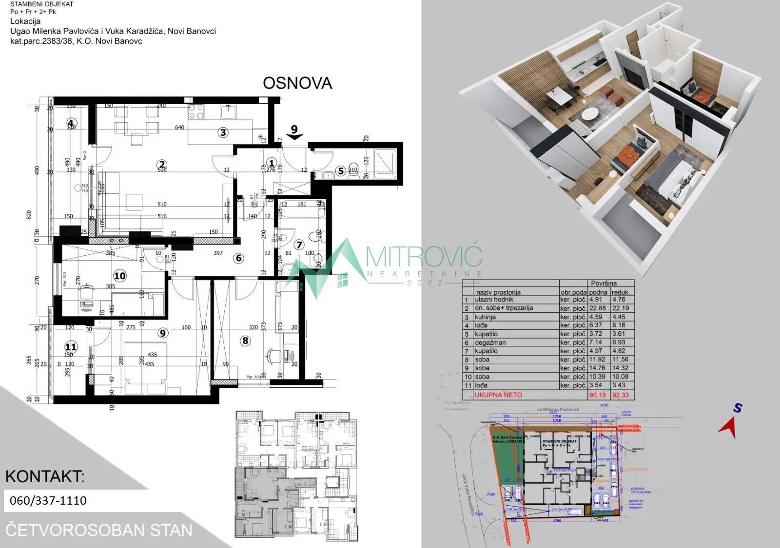 Stambeni objekat spratnosti P+3 u Novim Banovcima gradi se u mirnoj ulici, na samo par minuta od izlaza ka autoputu za Beograd i Novi Sad. Gradi se izuzetno luksuznim i kvalitetnim materijalima i oprema se najsavremenijom uvoznom opremom. Tehnička specifikacija: BETONSKA KONSTRUKCIJA se izvodi po principu skeletnog AB sistema sa debljinom AB ploče 22cm. FASADNI ZIDOVI se zidaju upotrebom NEXE KLIMA blokova koji po svojim karakteristikama obezbeđuju izvrsna termoizolaciona svojstva i dobru zvučnu izolaciju. FASADA OBJEKTA Objekat se izoluje upotrebom stiropora 10cm, a završna fasada se sastoji od kombinacije demit fasade i dela dekorativnih elemenata. FASADNA STOLARIJA koja se ugrađuje je PVC REHAU petotokomorna, staklo DVOSLOJNO SOLAR PUNJENO ARGONOM sa roletnama alu zastorom. UNUTRAŠNJA STOLARIJA Ulazna sigurnosna vrata, sobna i kupatilska imaju završnu obradu furnirani medijapan sa ukupnom visinom 2,20m. Sobna vrata sadrže skrivene šarke, eksluzivne kvake i magnetnu bravu. PARKET je proizvođača PORCELANOSA (Tortona 1L Plazza), višeslojni, prve klase,(proizvođač: Španija). KERAMIKA Keramika je proizvođača PORCELANOSA (Španija), SANITARIJE Sanitarije su od premium proizvođača PORCELANOSA (Španija), sanitarne armature i ugradni vodokotlić su takođe proizvođača PORCELANOSA (Španija), Tuš kabina sa staklenim paravanom, linijska kanalica za odvod vode proizvođača PORCELANOSA (Španija), GREJANJE I HLAĐENJE Grejanje na gas sa visokoefikasnim kondezacionim kotlom QUINTA ACE proizvođača REMEHA(Holandija), Sanitarna voda se greje električnim bojlerom. Hlađenje: svaki stan ima ugrađen klima uređaj proizvođača BERGEN najnovije generacije sa najvišim tehničkim karakteristikama ONOFF klase koji obezbeđuje zdrav vazduh u prostoriji. Uređaj kao rashladno sredstvo koristi ekološki freon R410 što obezbeđuje efikasniji rad sistema, a manji uticaj na životnu sredinu. Pripada energetskoj klasi AA, što osigurava uštedu u potrošnji. OSTALO Objekat raspolaže garažnim i parking mestima. Telefonija, internet i televizija su rešeni optičkom infrastrukturom. Ulaz i stan su povezani interfonskom linijom. Stan je odmah useljiv, a u oglašenu cenu je uračunat i PDV. Za sve informacije kontakt 0603371110