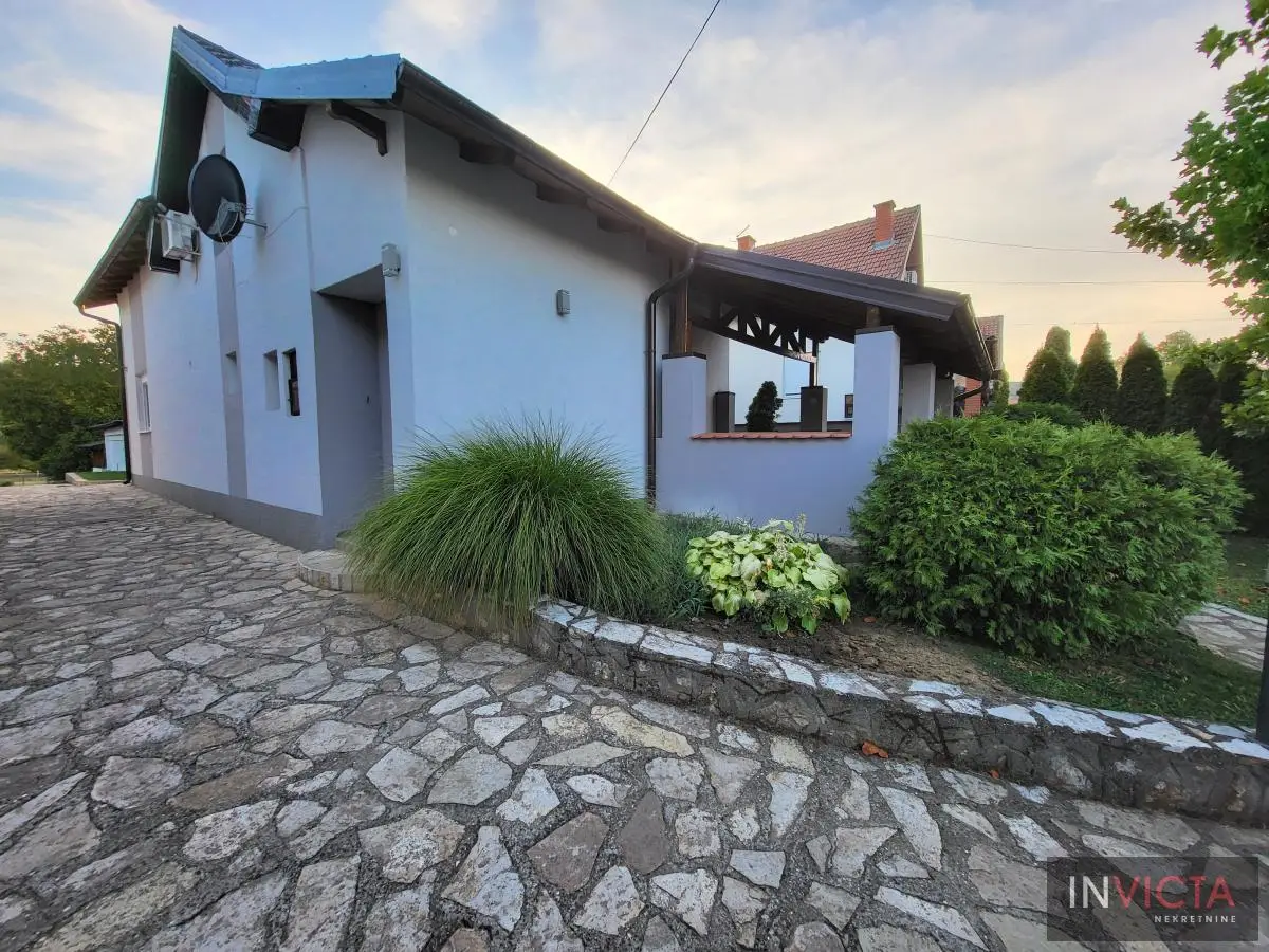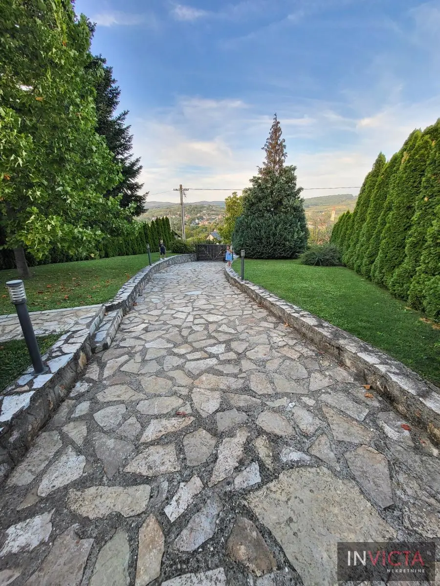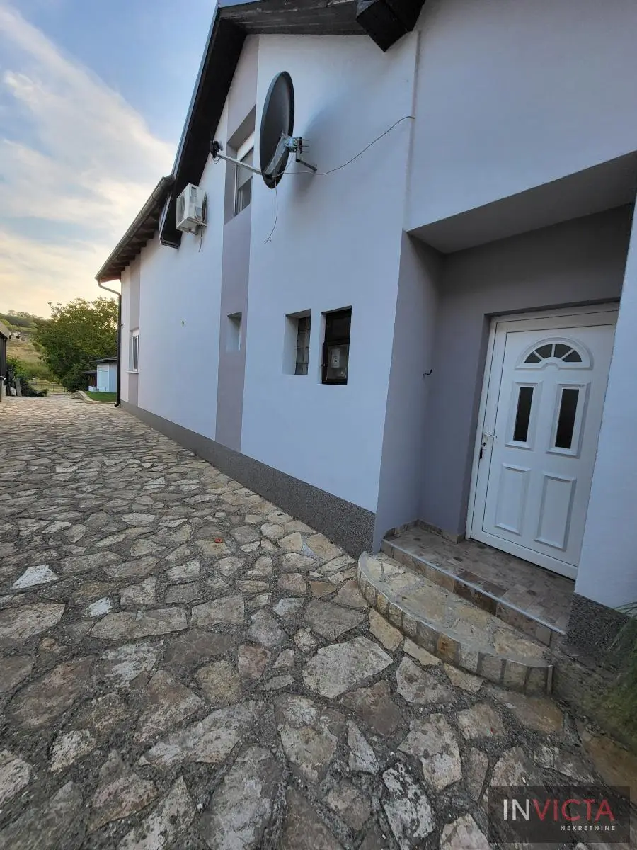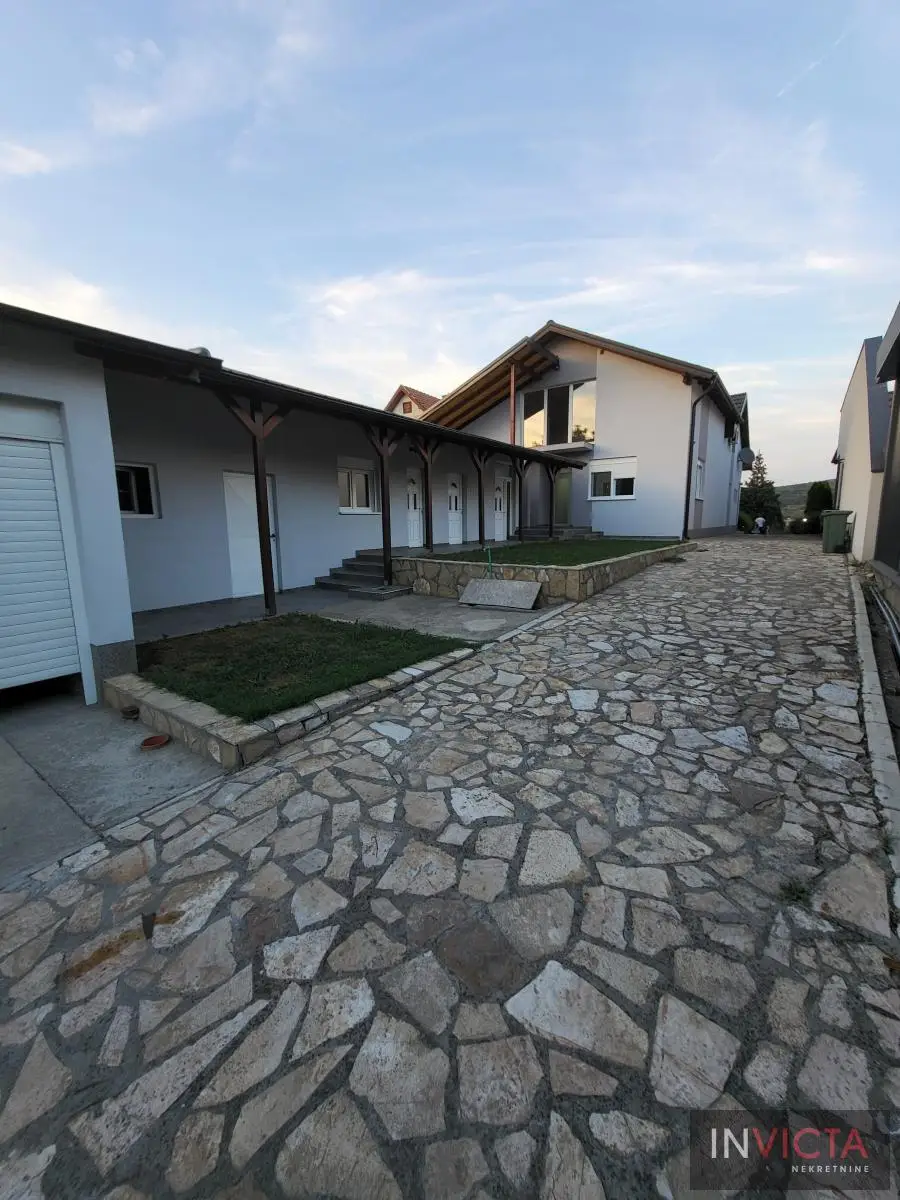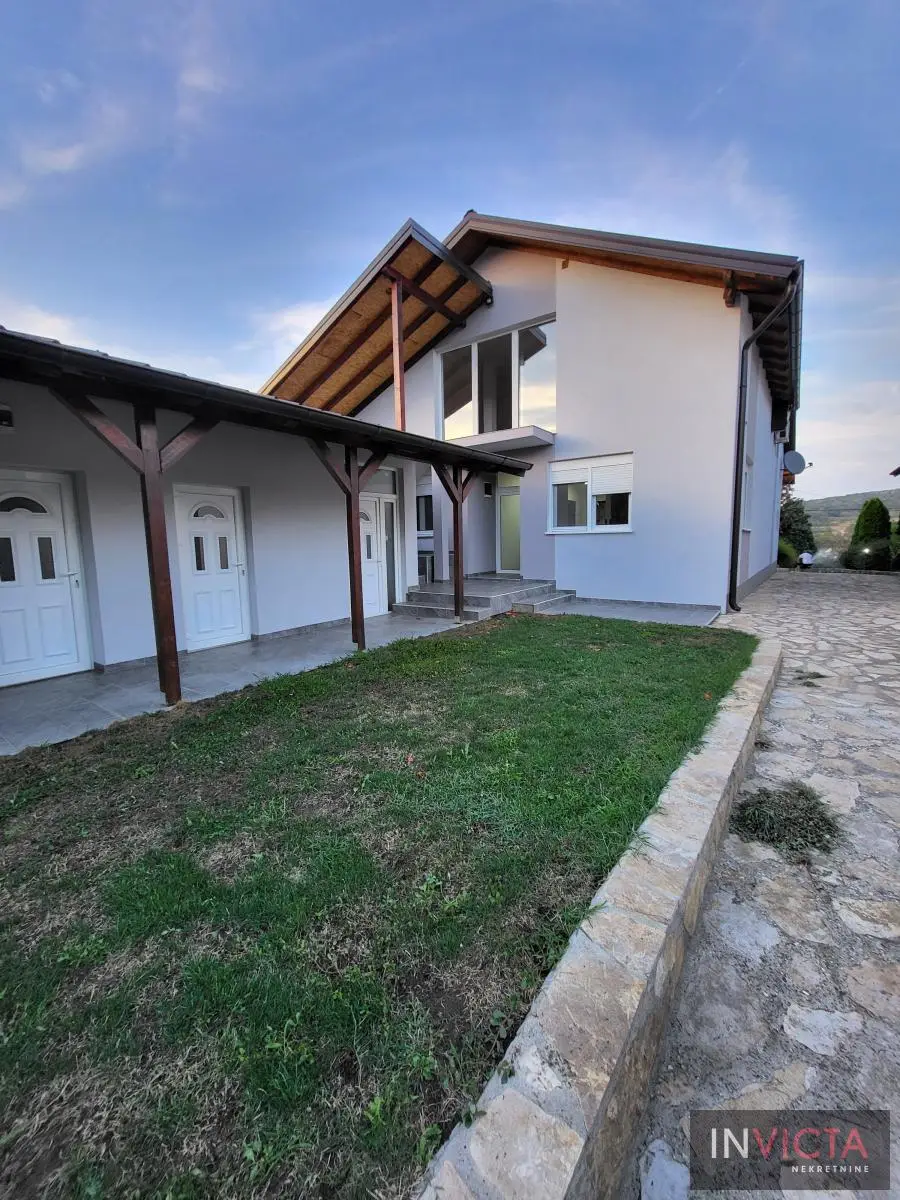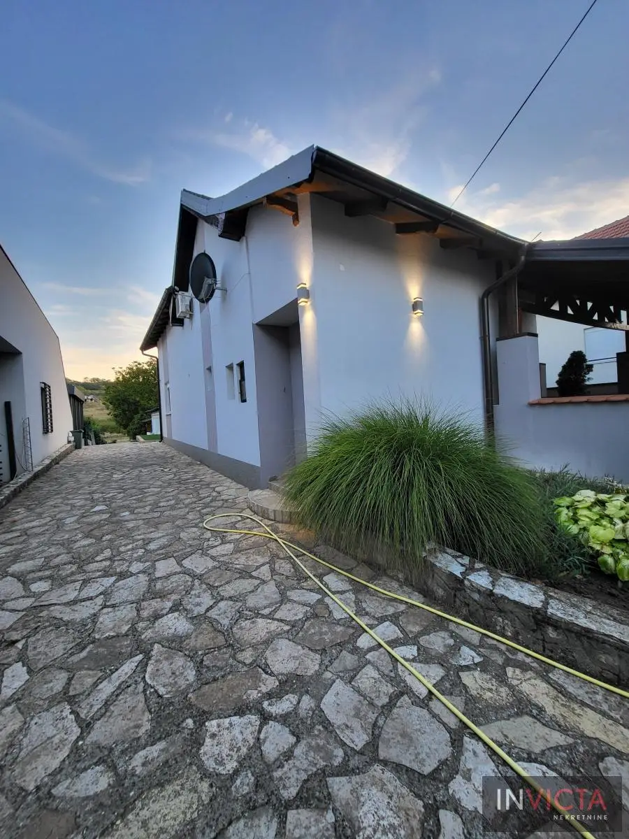 Odlična, novoizgrađena porodična kuća u jednom od najlepših naselja, simpatičnom turističkom gradiću na Fruškoj gori, na blago brdovitom predelu okruženo šumom, poznatom po termalnim vodama, idealno mesto za život u prirodi u mirnom okruženju. Osim po poznatoj banji-lečilištu, poznato ja i kao "vazdušna banja". Izgradnjom jednog od najlluksuznijeg hotela sa velikim brojem bazena, restorana, sportskih terena i svih ostalih pratećih sadržaja, Vrdnik dobija za sve većem značaju i na turističkoj karti kako Srbije, tako i okruženja. Predmetna nepokretnost, porodična kuća se nalazi nedaleko od centra mesta, na uzvišenju, u mirnoj ulici, sa prelepim pogledom na gradić i obronke Fruške gore. Percela je površine 1500 m2 i izlazi na dve ulice. Ograda, prilazne staze, podzidi, urađeni od fruškogorskog kamena se uklapaju u planinski pejzaž. Sama kuća se sastoji od dve zasebne stambene jedinice koje su spojive unutrašnjom vezom, a opet imaju mogućnost zasebnog ulaza. Prva celina u prizemlju ima prostrano kupatilo, dnevni boravak sa vezom ka nakrivenoj terasi, odvojenu kuhinju sa trpezarijskim delom i dve sobe koje mogu imati namenu naspram potreba korisnika. Na potkrovlju su dve spavaće sobe, te poseban apartman koji se sastoji iz velikog dnevnog boravka sa staklenim portalima koji se prostiru skoro celom širinom prosttorije, spavaće sobe i prostranog kupatila. U nastavku kuće, u dvorišnom krilu su pomoćne prostorije i to: letnja kuhinja, ostava, ostava za drva, garaža za dva vozila, te u suterenu prelep vinski podrum ozidan sa sirovom ciglom. Na kraju je još jedna velika nadkrivena terasa kao mesto predviđeno za okupljanja, druženja uz roštilj ili sl. U uređenom dvorištu su razne biljke, od zimzelenih četinara, pa do voćki poput oraha i sl. Grejanja na gas. Uredna pravna dokumentacija, uknjižena i odmah useljiva nepokretnost. Broj u Reg.posrednika 475.