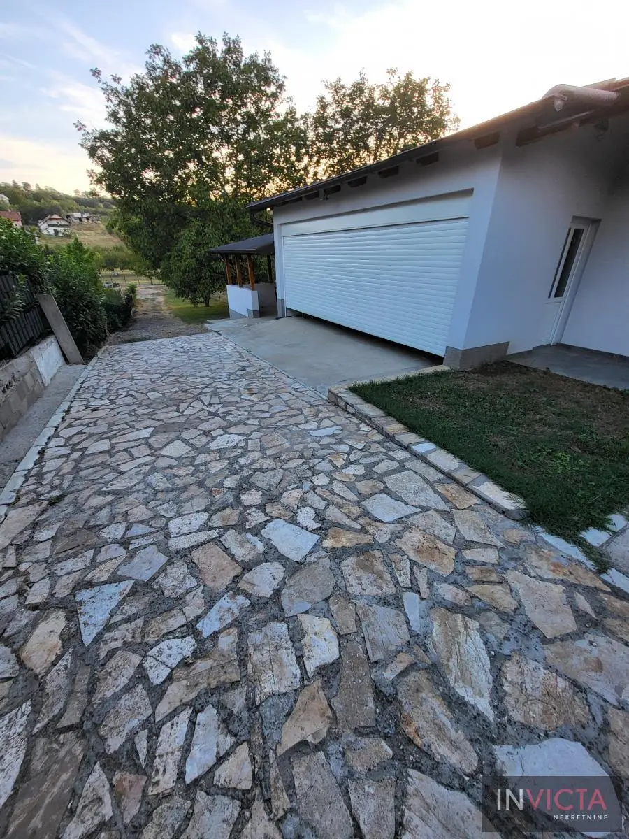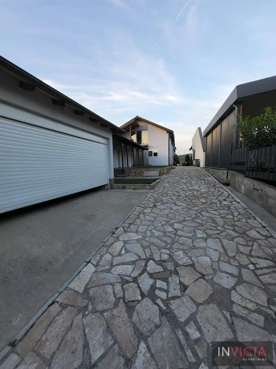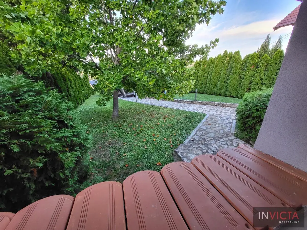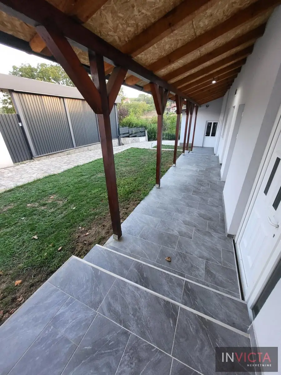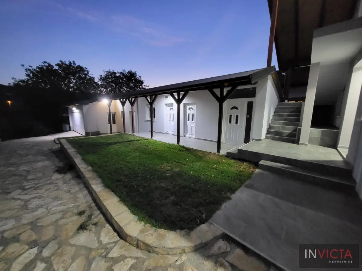 Odlična, novoizgrađena porodična kuća u jednom od najlepših naselja, simpatičnom turističkom gradiću na Fruškoj gori, na blago brdovitom predelu okruženo šumom, poznatom po termalnim vodama, idealno mesto za život u prirodi u mirnom okruženju. Osim po poznatoj banji-lečilištu, poznato ja i kao "vazdušna banja". Izgradnjom jednog od najlluksuznijeg hotela sa velikim brojem bazena, restorana, sportskih terena i svih ostalih pratećih sadržaja, Vrdnik dobija za sve većem značaju i na turističkoj karti kako Srbije, tako i okruženja. Predmetna nepokretnost, porodična kuća se nalazi nedaleko od centra mesta, na uzvišenju, u mirnoj ulici, sa prelepim pogledom na gradić i obronke Fruške gore. Percela je površine 1500 m2 i izlazi na dve ulice. Ograda, prilazne staze, podzidi, urađeni od fruškogorskog kamena se uklapaju u planinski pejzaž. Sama kuća se sastoji od dve zasebne stambene jedinice koje su spojive unutrašnjom vezom, a opet imaju mogućnost zasebnog ulaza. Prva celina u prizemlju ima prostrano kupatilo, dnevni boravak sa vezom ka nakrivenoj terasi, odvojenu kuhinju sa trpezarijskim delom i dve sobe koje mogu imati namenu naspram potreba korisnika. Na potkrovlju su dve spavaće sobe, te poseban apartman koji se sastoji iz velikog dnevnog boravka sa staklenim portalima koji se prostiru skoro celom širinom prosttorije, spavaće sobe i prostranog kupatila. U nastavku kuće, u dvorišnom krilu su pomoćne prostorije i to: letnja kuhinja, ostava, ostava za drva, garaža za dva vozila, te u suterenu prelep vinski podrum ozidan sa sirovom ciglom. Na kraju je još jedna velika nadkrivena terasa kao mesto predviđeno za okupljanja, druženja uz roštilj ili sl. U uređenom dvorištu su razne biljke, od zimzelenih četinara, pa do voćki poput oraha i sl. Grejanja na gas. Uredna pravna dokumentacija, uknjižena i odmah useljiva nepokretnost. Broj u Reg.posrednika 475.