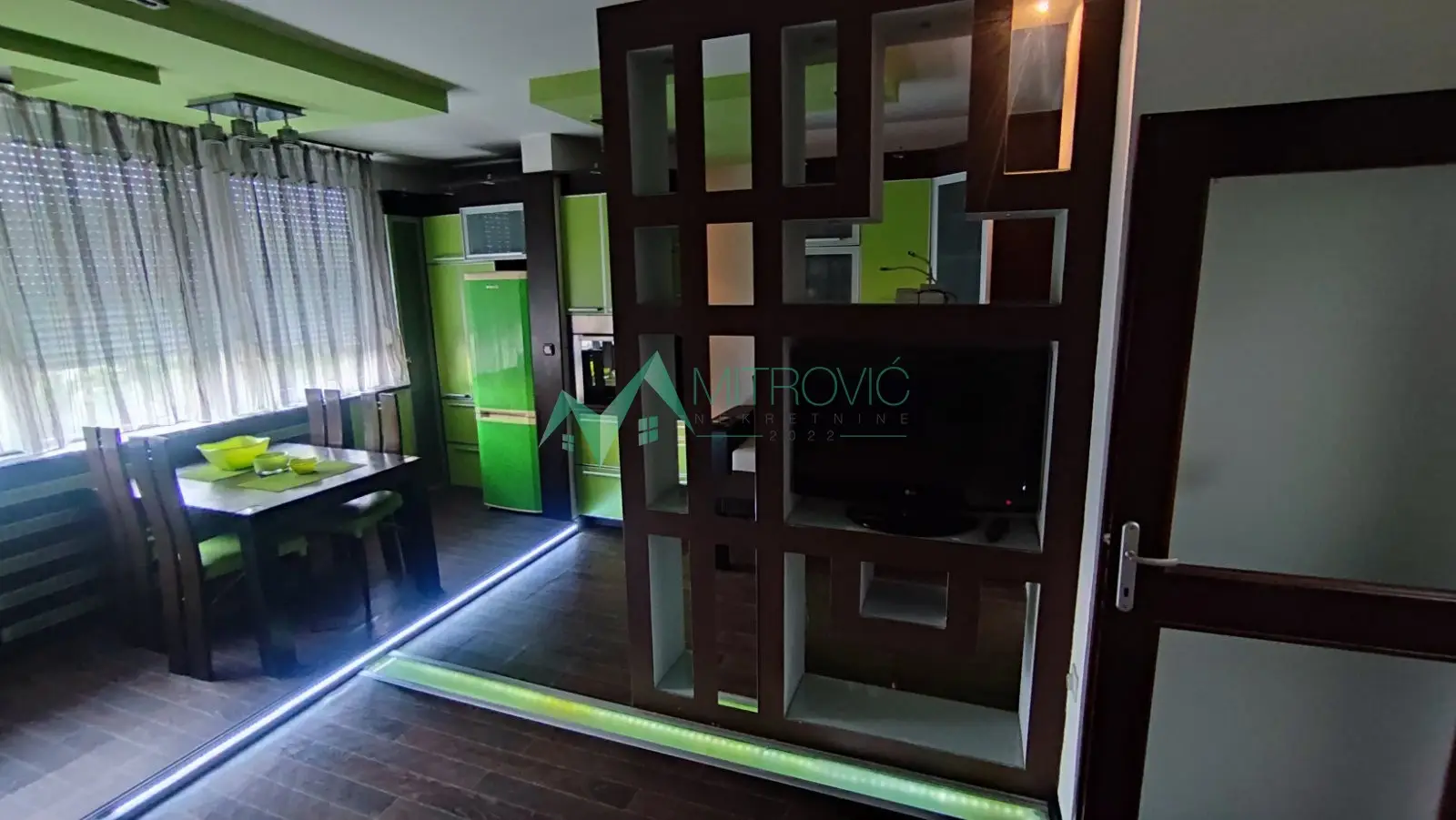 Poseduje dnevnu sobu, kuhinju(frižider, šporet, mašina za sudove), spavaću sobu, kupatilo( mašina za pranje, mašin…