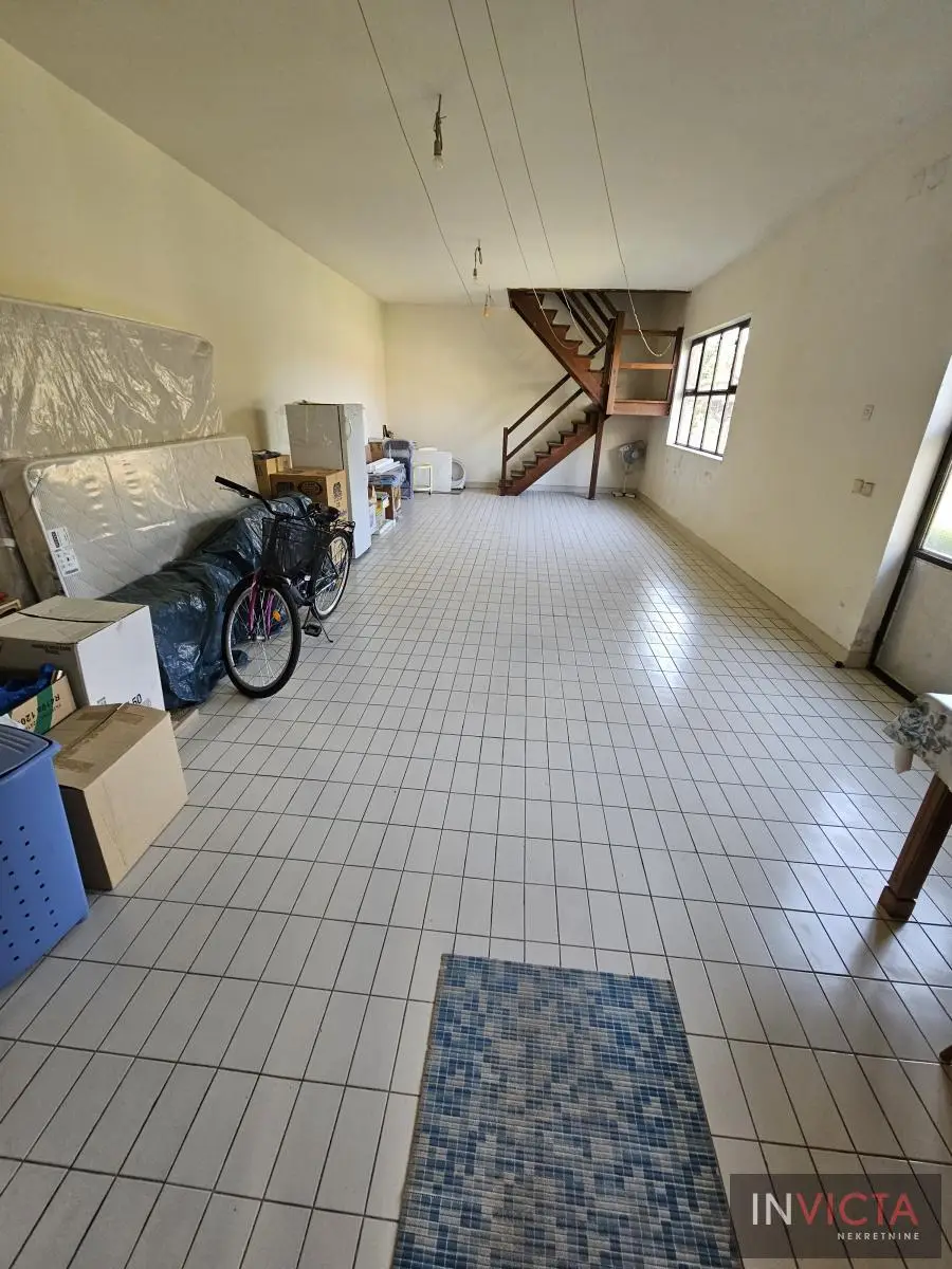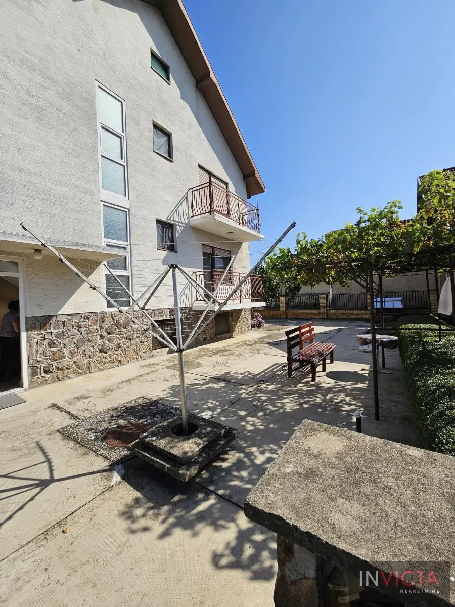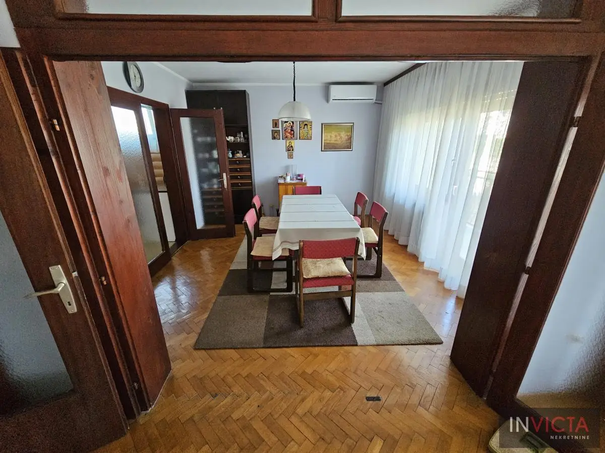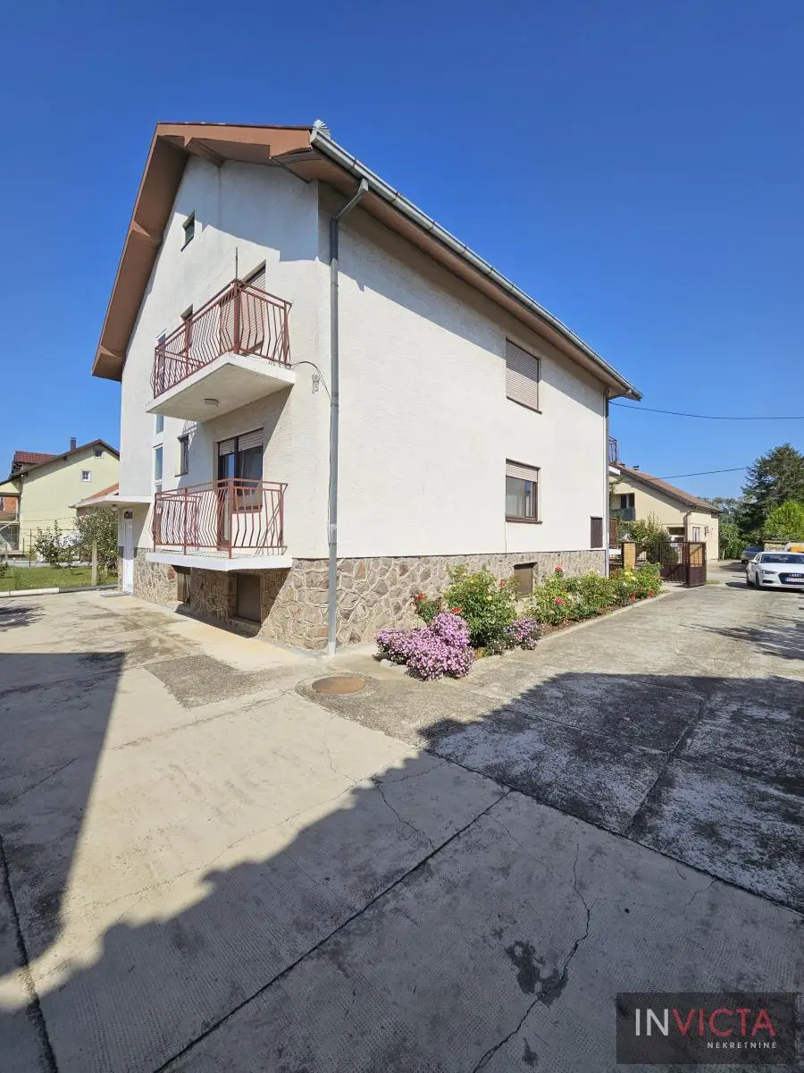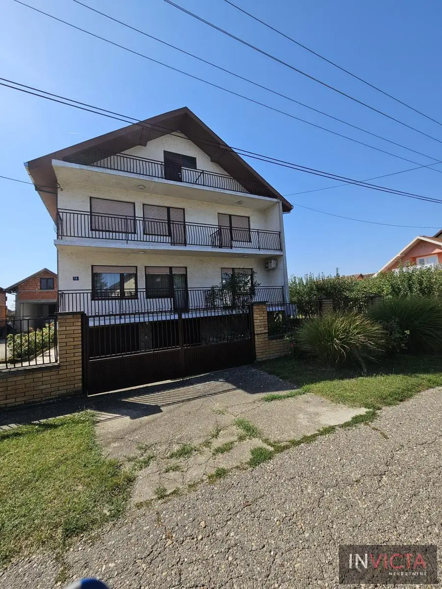 Klasična, građevinski odlično izgrađena porodična kuća sa dve potpuno odvojene trosobne stambene jedinice, sa posebnim strujnim brojilima. Mogućnost komfornog stanovanja za dve porodce. Kuća je u osnovi 120 m2, uknjižena po etažama (polusuteren 89m2, prizemlje 115m2, sprat 112m2), poslovni objekat površine 122m2, na parceli površine 885m2. U suterenu je više prostorija koje se koriste kao ostave i kotlarnica (3 vrste grejanja). Na visokom prizemlju i prvom spratu su dve identične stambene jedinice sa po dve prostrane spavaće sobe, kupatilom, toaletom, velikim dnevnim boravkom koji je povezan sa trpezarijom i terasom, te velikom odvojenom kuhinjom. U dvorištu je poslovni objekat (PR+1+tavan) u osnovi 5x25m2, sređen, sa sanitarnim čvorom. Kolski ulaz, dvorište sređeno, asfalt+zeleni deo u kome je bašta, voćnjak. Ulični front je 18m. , dužina 50m.. Uredna pravna dokumentacija. Brzo useljiva nekretnina . Broj u Reg.posrednika 2107.